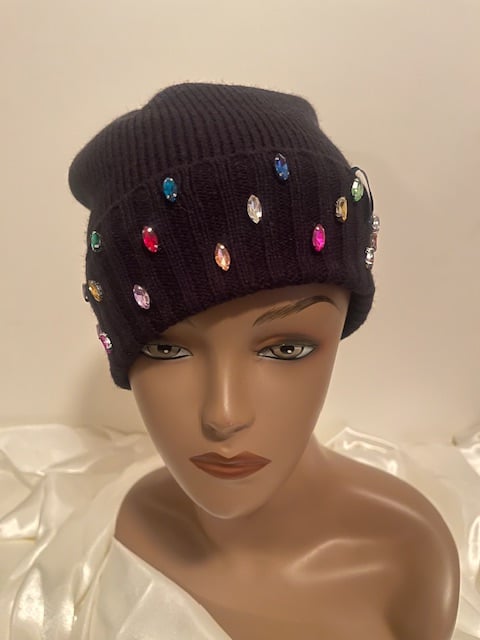 Custom black beanie with multi colored gems to give a little pop. Add some flavor to any outfit. Insulation on the inside for extra protection from cold weather.