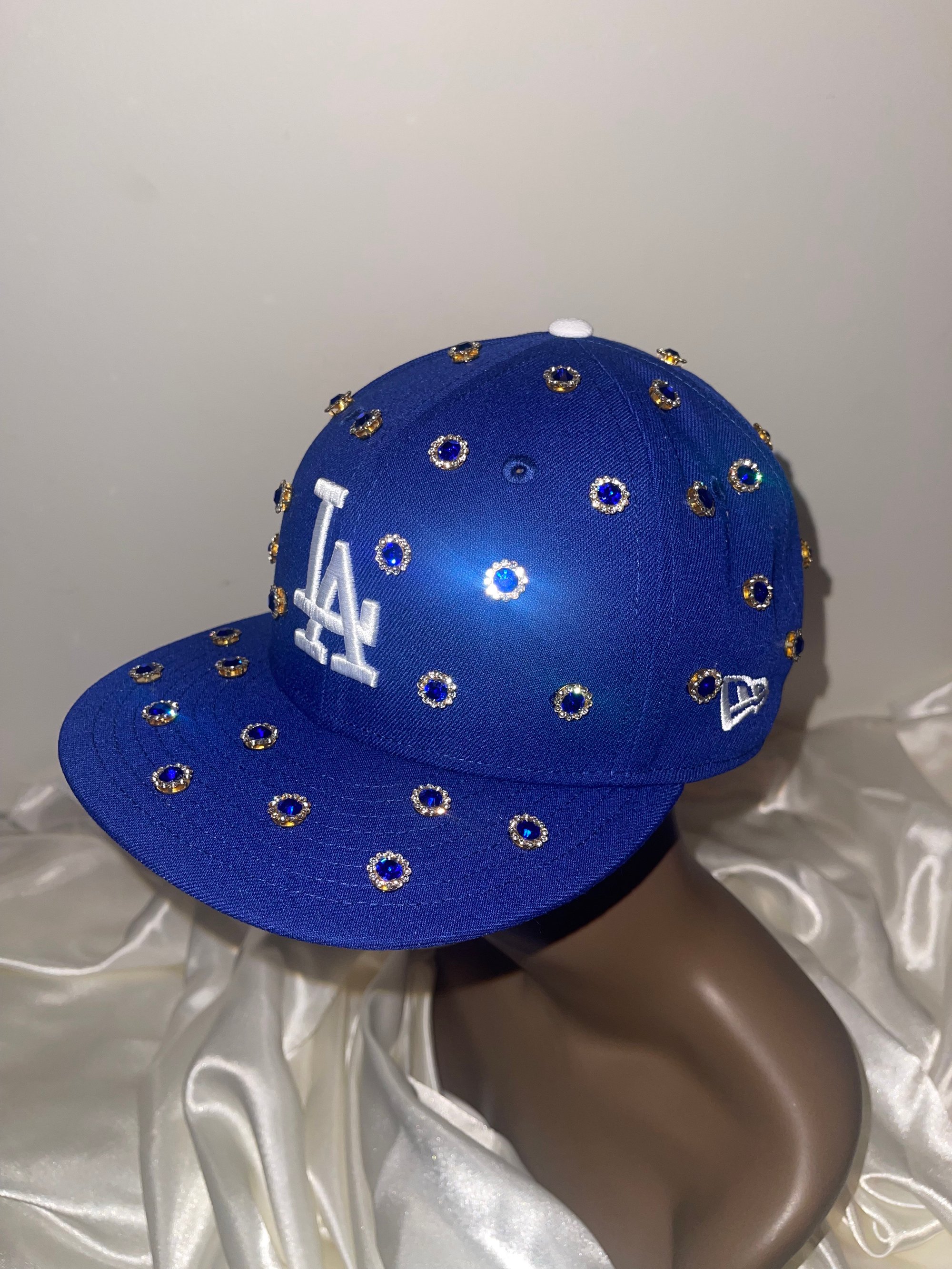 LA custom fitted hat with blue gems (unisex). Snap back for adjustable fit. The gems on this hat bring an extra flare to your any outfit. Stand out in the crowd